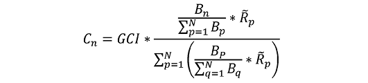 GCI – годишњи циљани износ из тачке 2. став 2. ове одлуке, умањен за износ годишњих доприноса утврђених у складу са тачком 25. став 2. ове одлуке и за укупан износ фиксних доприноса обрачунатих у складу са тачком 28. те одлуке и