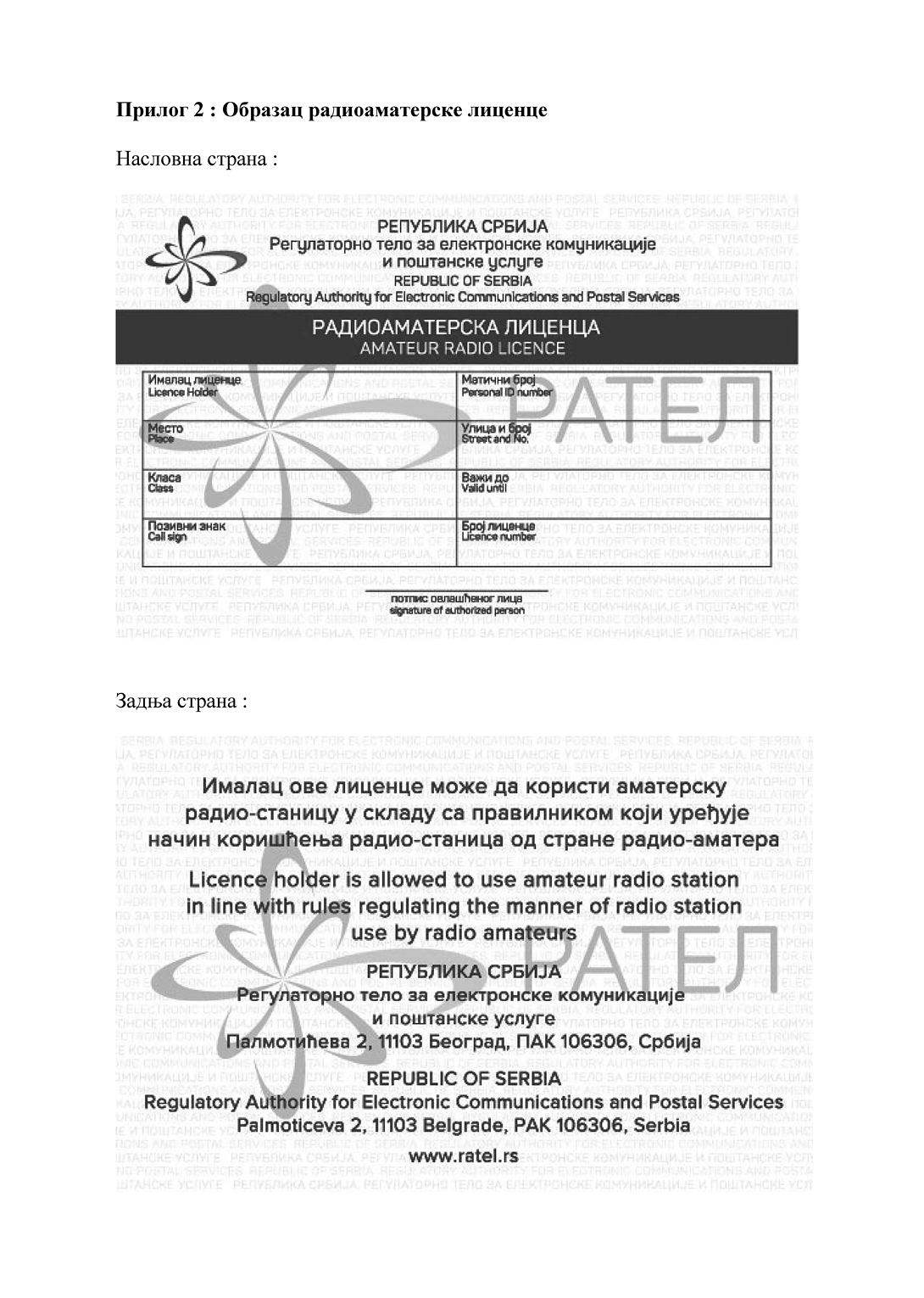Образац радиоаматерске лиценце је дат у Прилогу 2, који је одштампан уз овај правилник и чини његов саставни део.