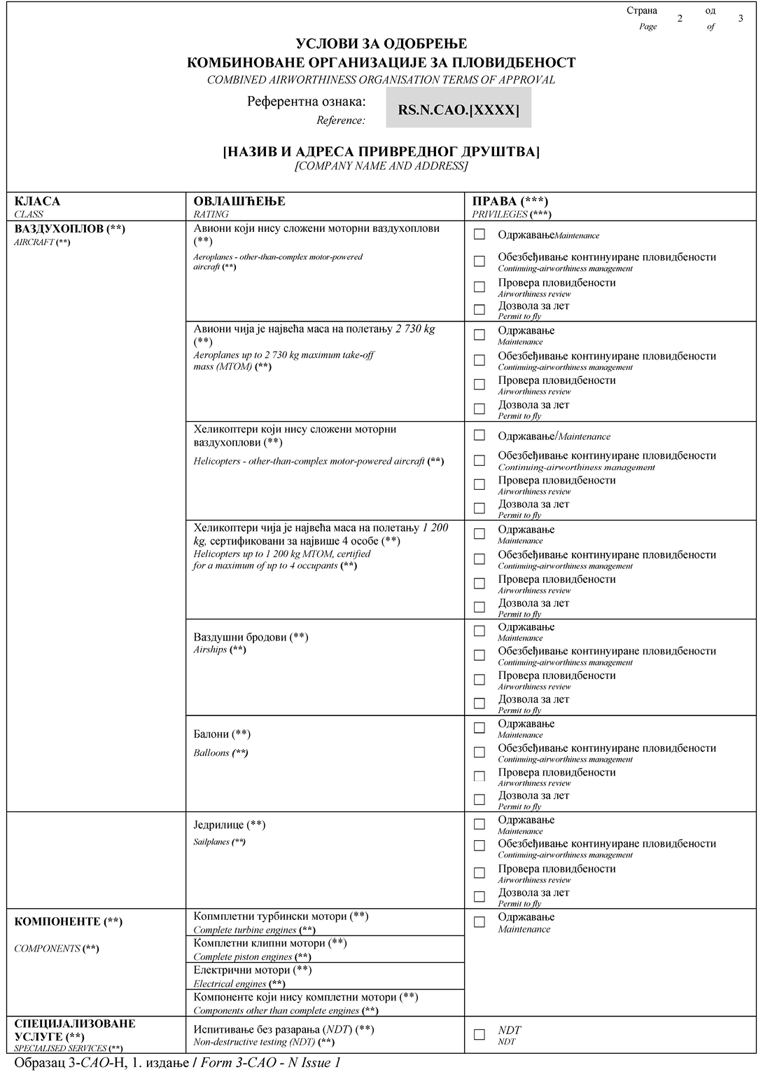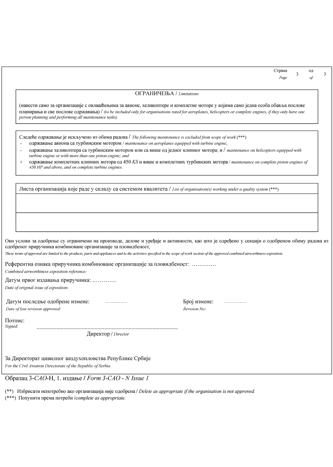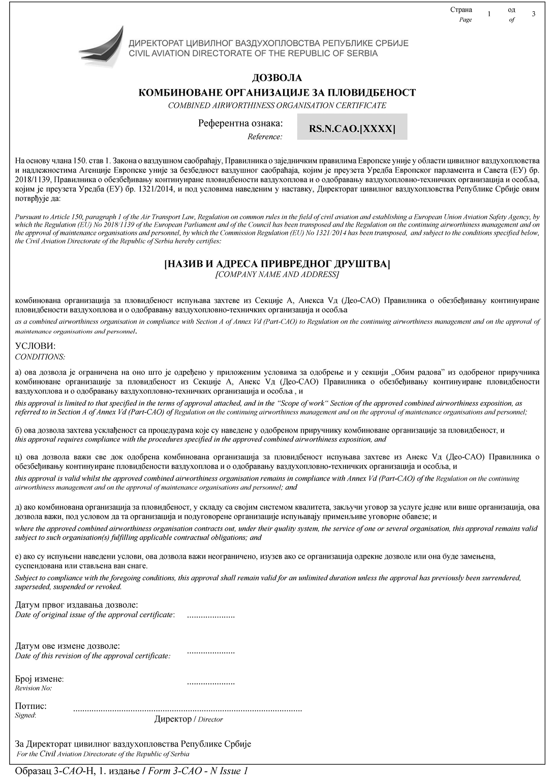 „Потврђује се да су наведени радови спроведени у складу са Законом о ваздушном саобраћају и Правилником о обезбеђивању континуиране пловидбености ваздухоплова и о одобравању ваздухопловно-техничких организација и особља (Део-CAO и допунски услови који се односе на примену Дела-CAO) и у односу на те радове ваздухоплов/компонента се сматра спремним за употребу.ˮ