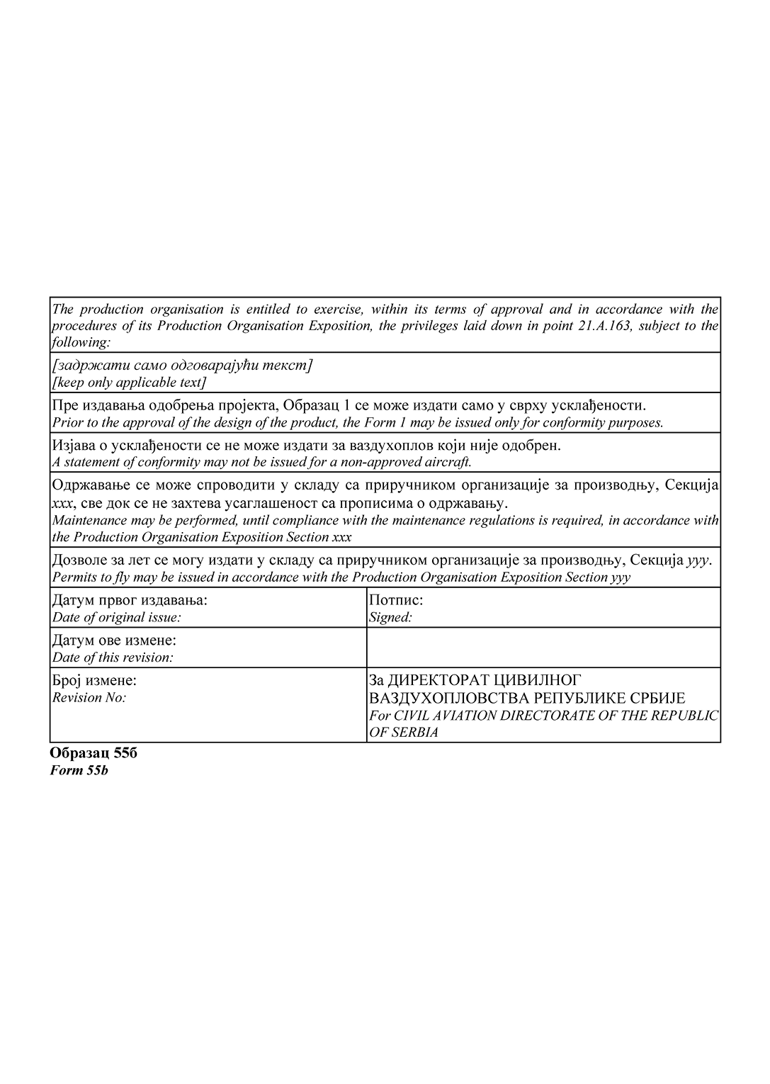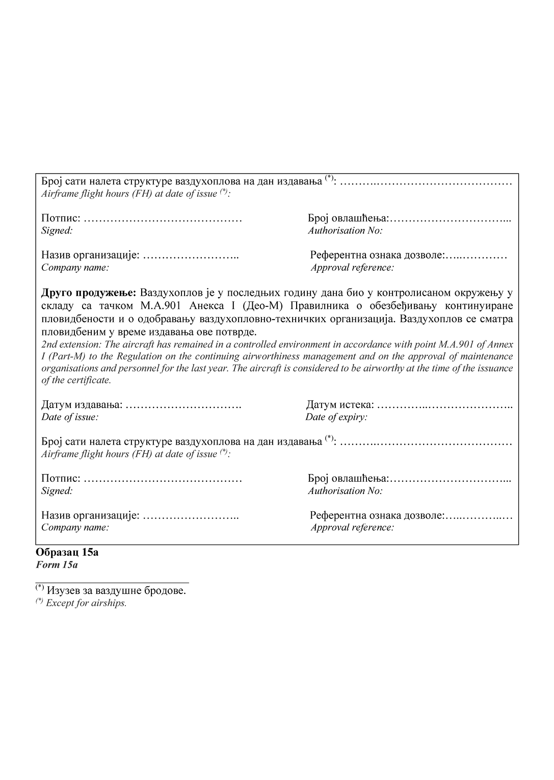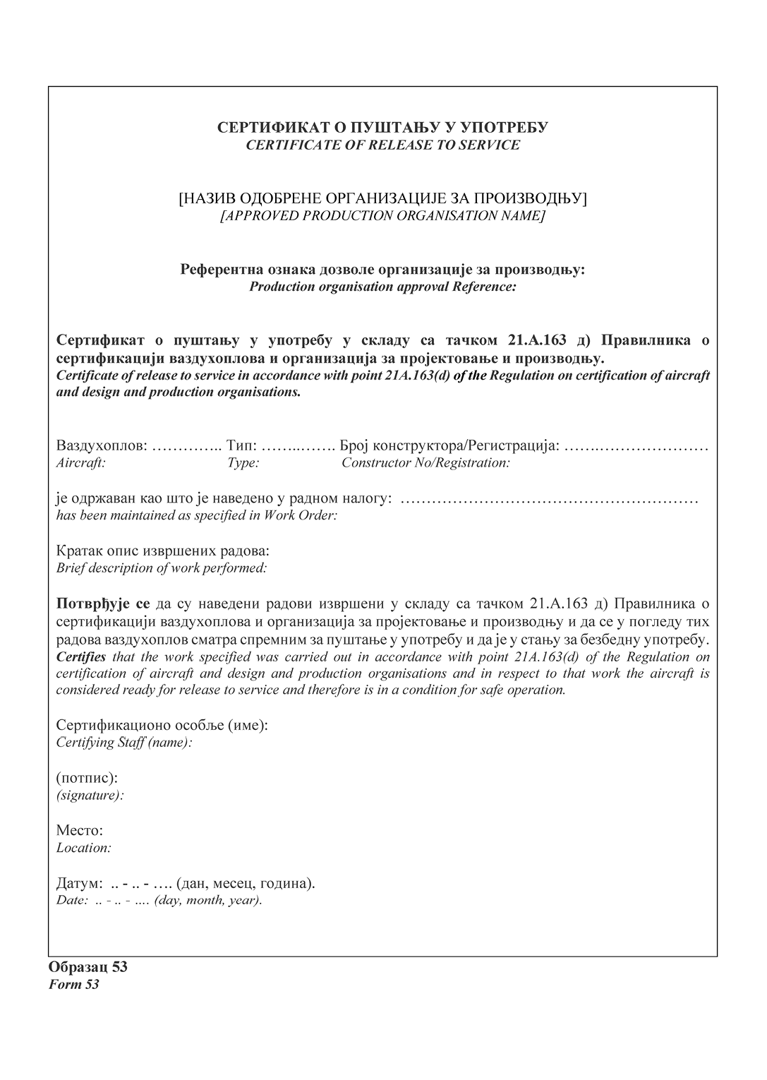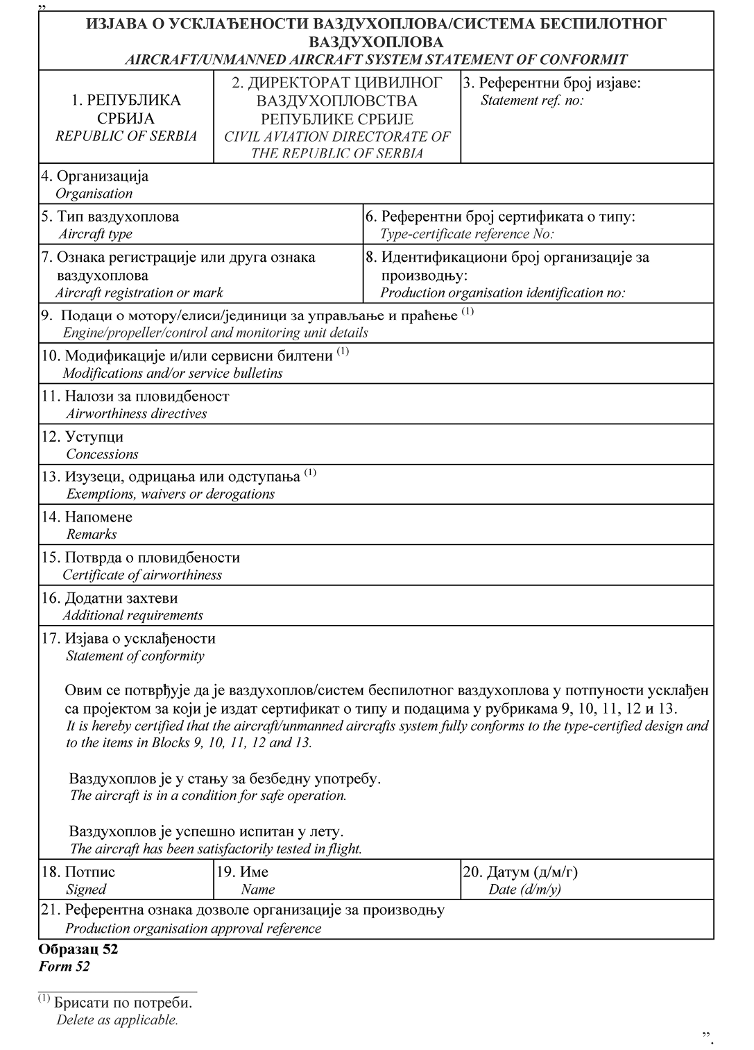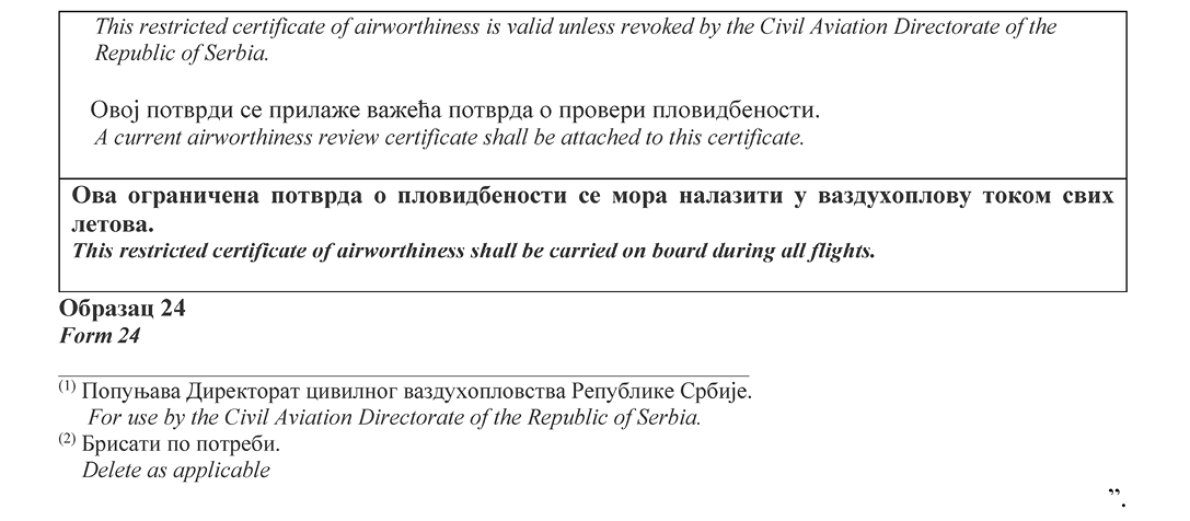 НАПОМЕНА ИЗДАВАЧА: Правилником о изменама и допунама Правилника о сертификацији ваздухоплова и организација за пројектовање и производњу ("Службени гласник РС", број 95/2025) у Прилогу 2 додат је Образац 15д и замењени су обрасци 20а, 20б, 24, 25, 52 и 55а (види члан 115. Правилника - 95/2025-57).