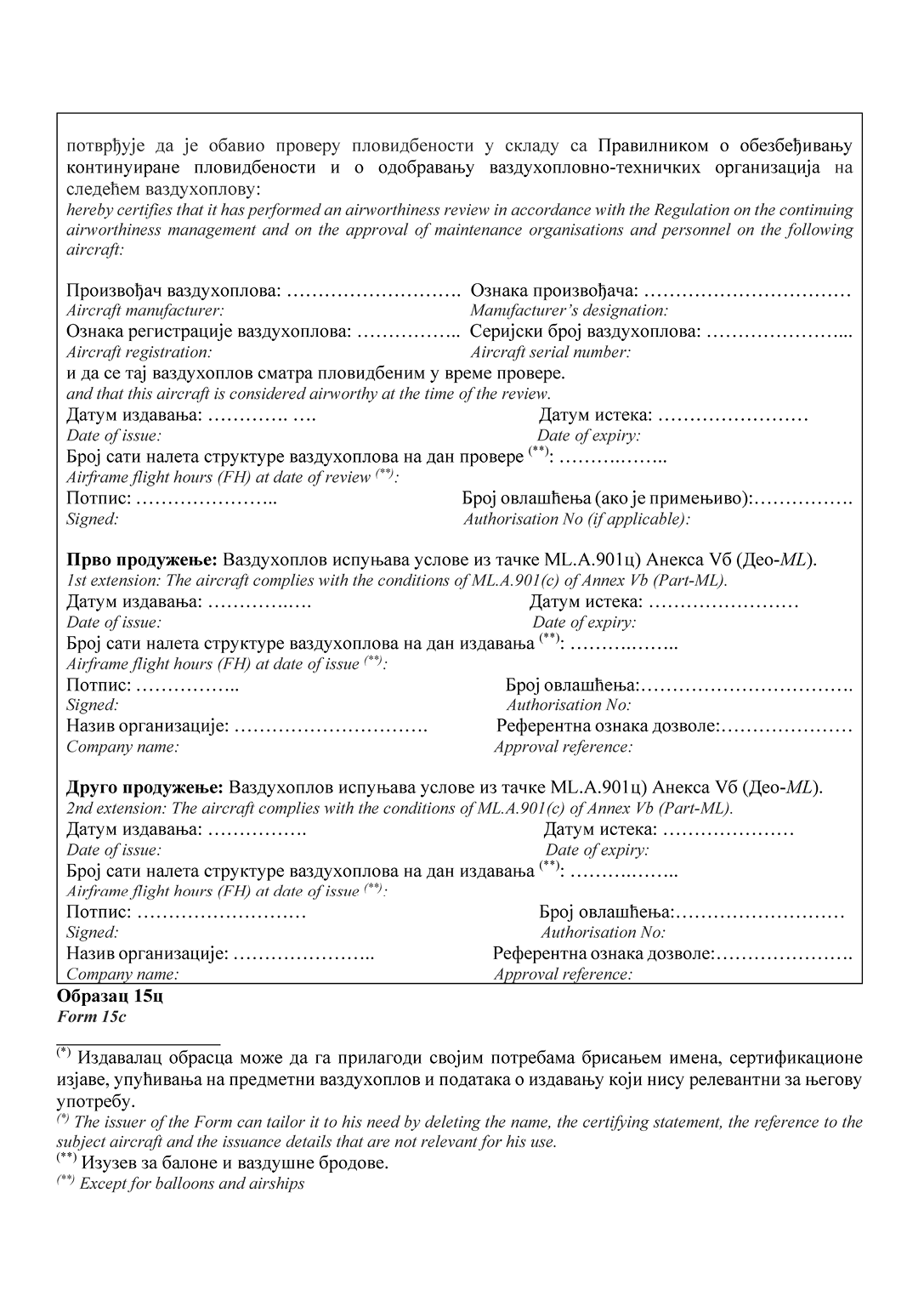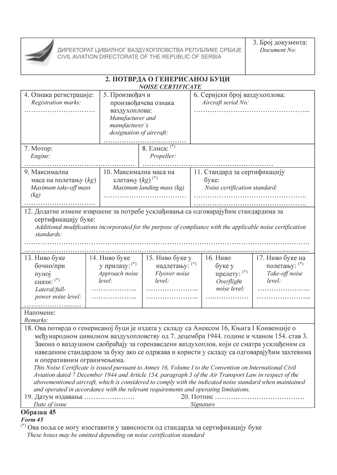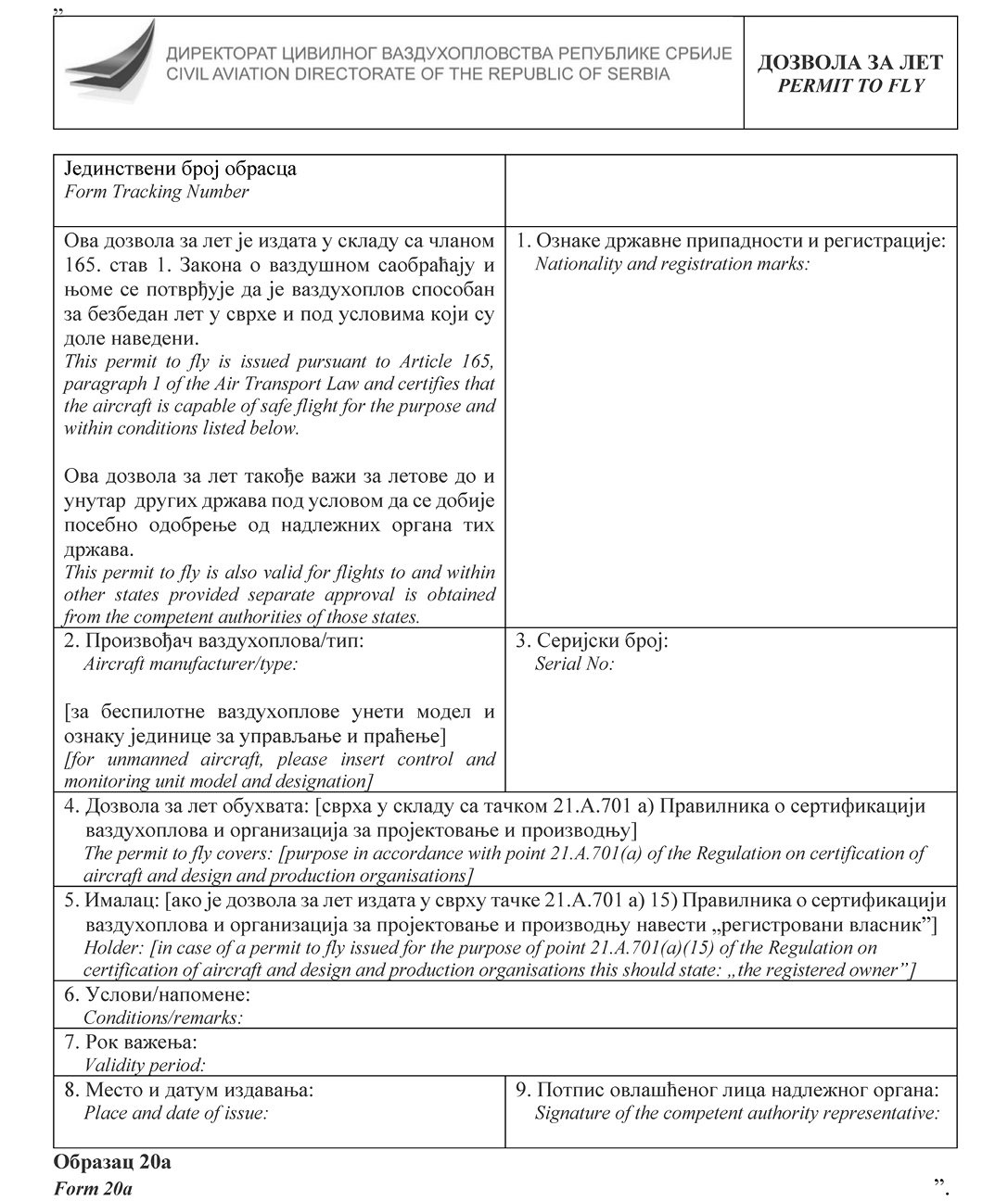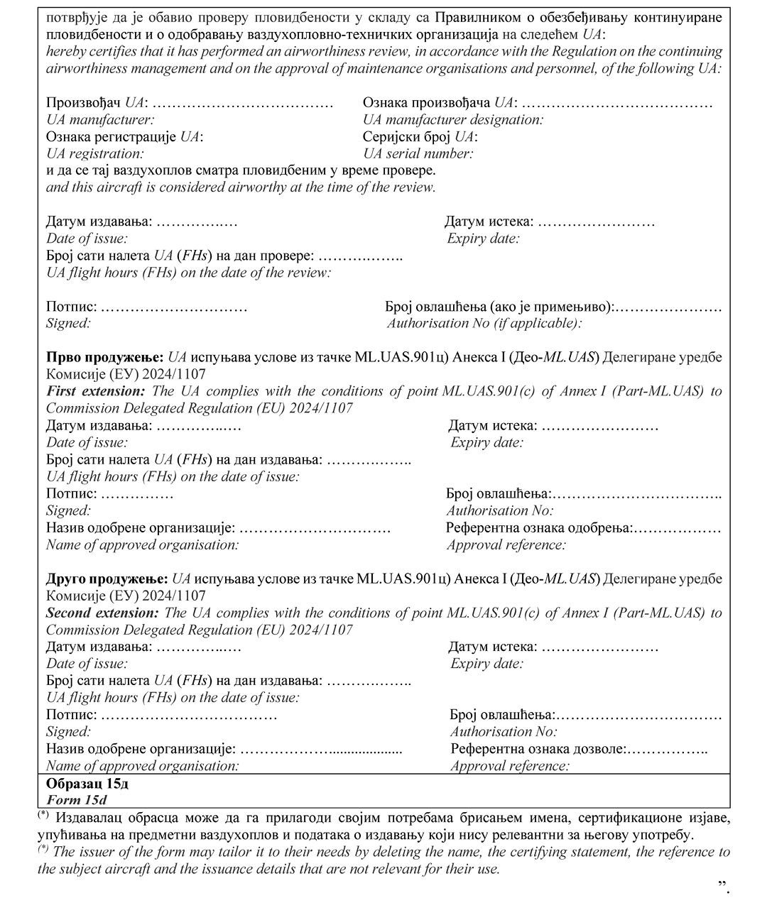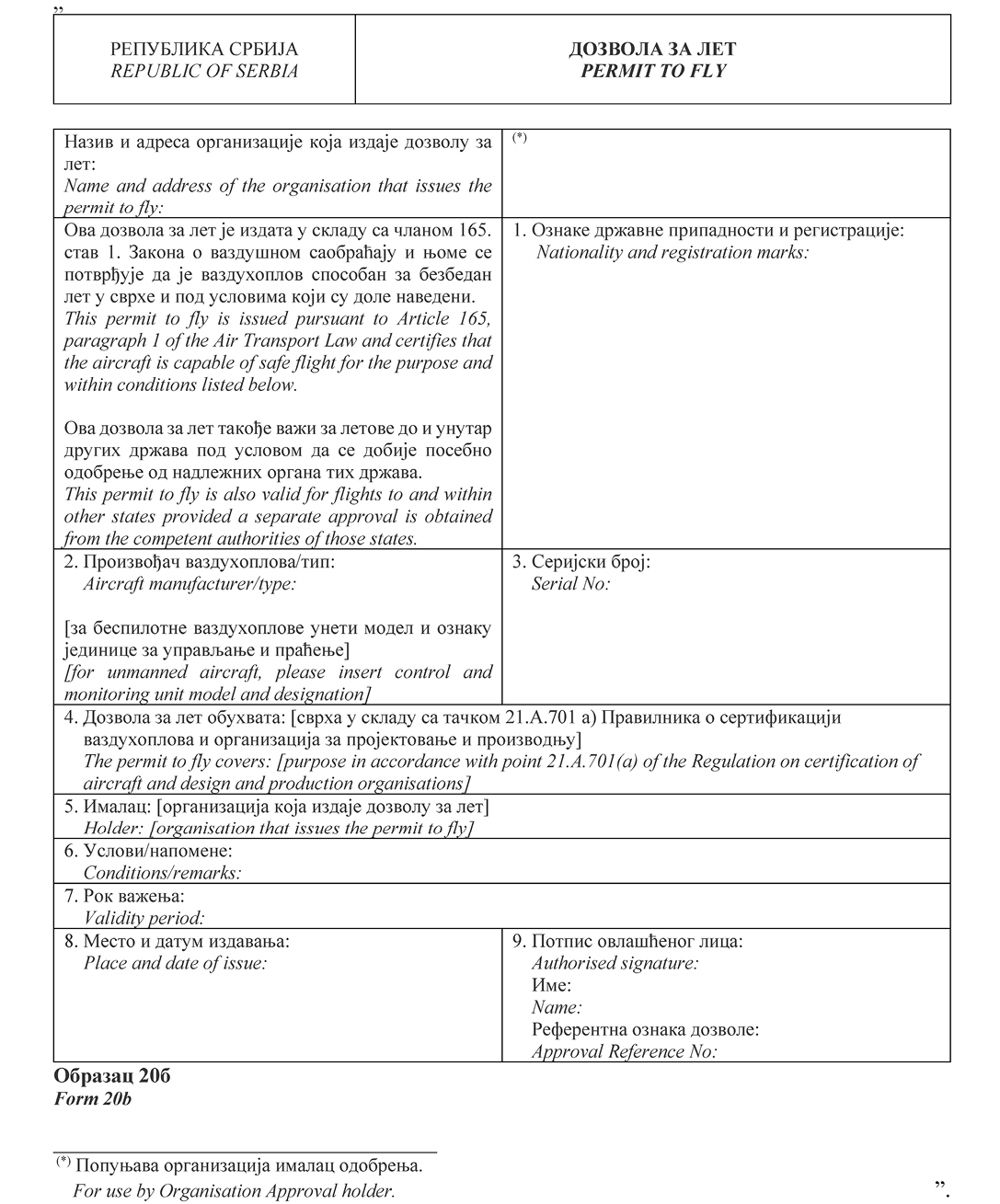 НАПОМЕНА ИЗДАВАЧА: Правилником о изменама и допунама Правилника о сертификацији ваздухоплова и организација за пројектовање и производњу ("Службени гласник РС", број 95/2025) у Прилогу 2 додат је Образац 15д и замењени су обрасци 20а, 20б, 24, 25, 52 и 55а (види члан 115. Правилника - 95/2025-57).