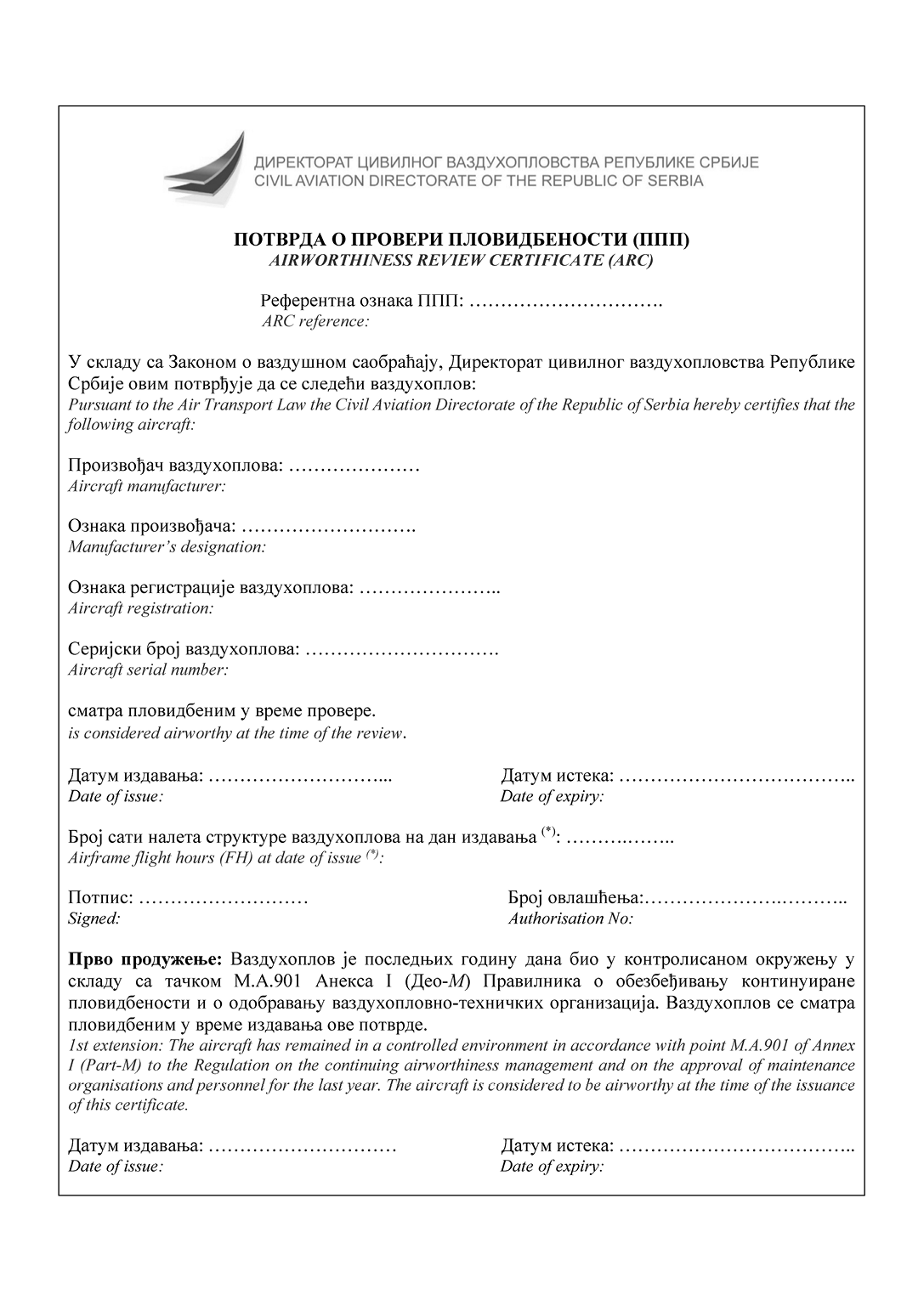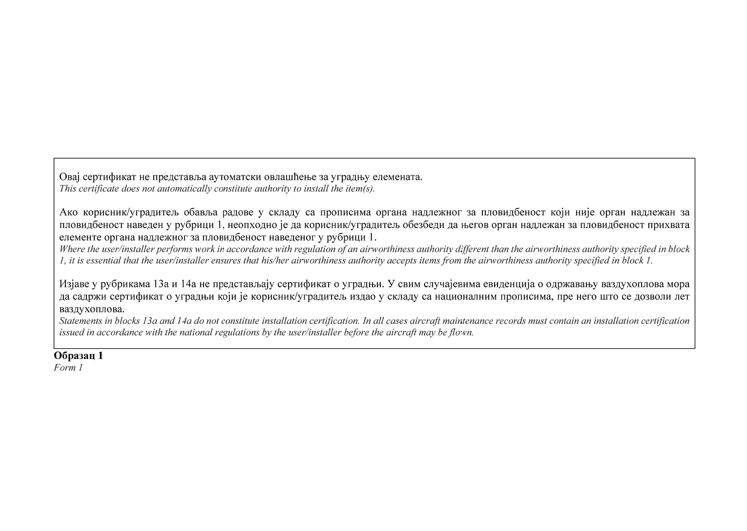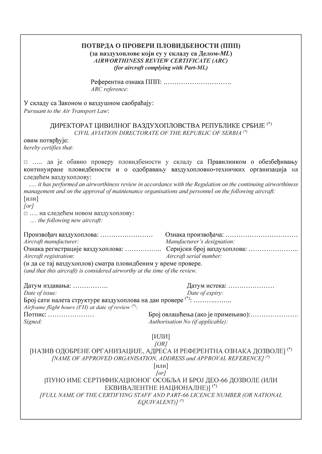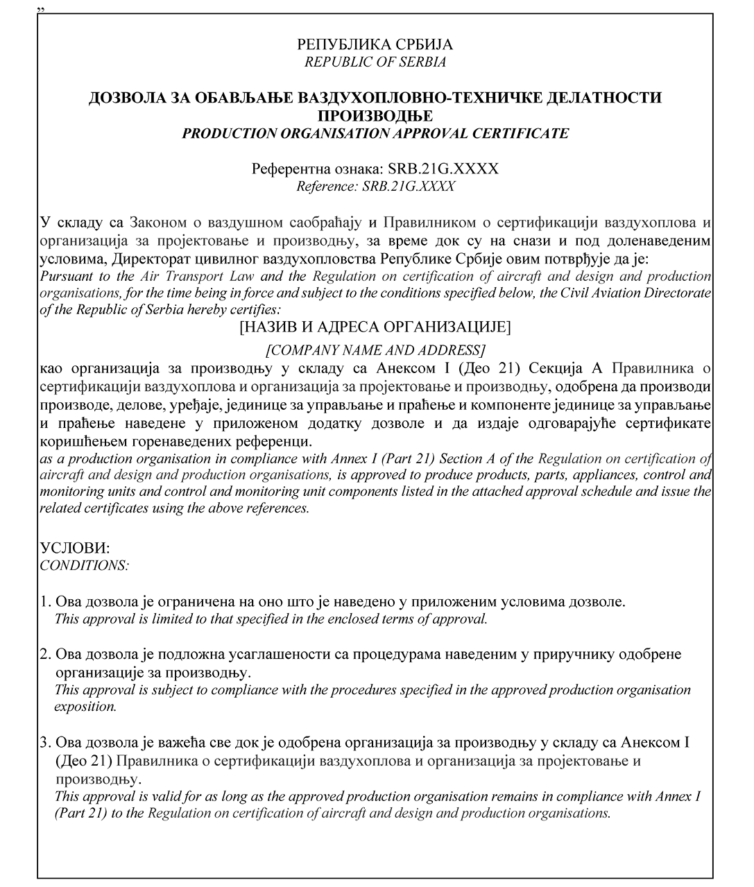НАПОМЕНА ИЗДАВАЧА: Правилником о изменама и допунама Правилника о сертификацији ваздухоплова и организација за пројектовање и производњу ("Службени гласник РС", број 95/2025) у Прилогу 2 додат је Образац 15д и замењени су обрасци 20а, 20б, 24, 25, 52 и 55а (види члан 115. Правилника - 95/2025-57).